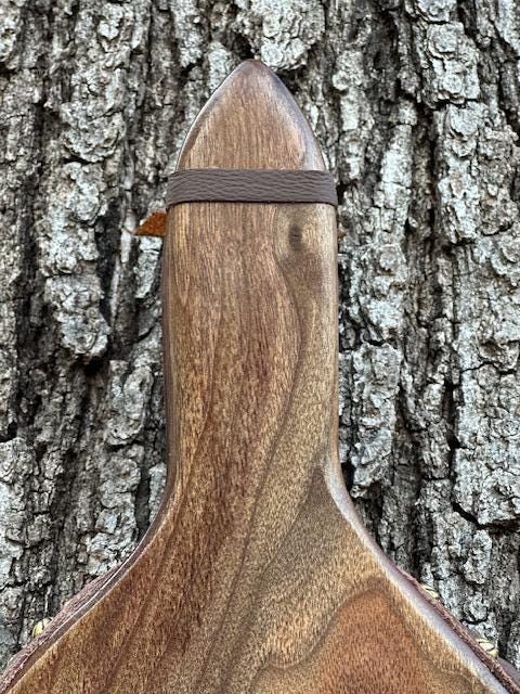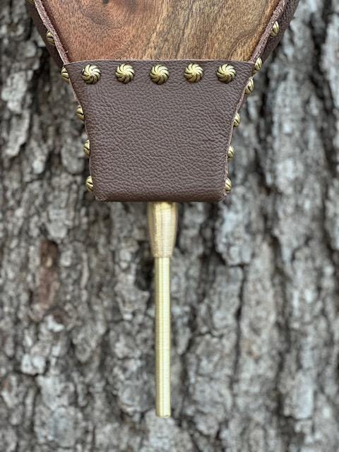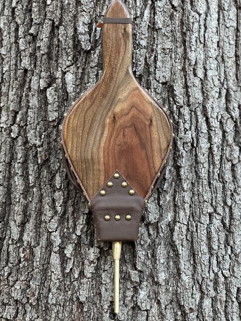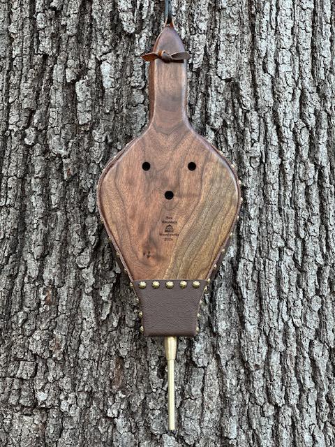 The smooth, uncarved surface highlights the character of the walnut, allowing the organic patterns to take center stage. The leather is a deep, luxurious brown, secured with swirled brass tacks that complement the warm and varied tones of the wood. The bellows feature a solid brass nozzle to tie the design together.