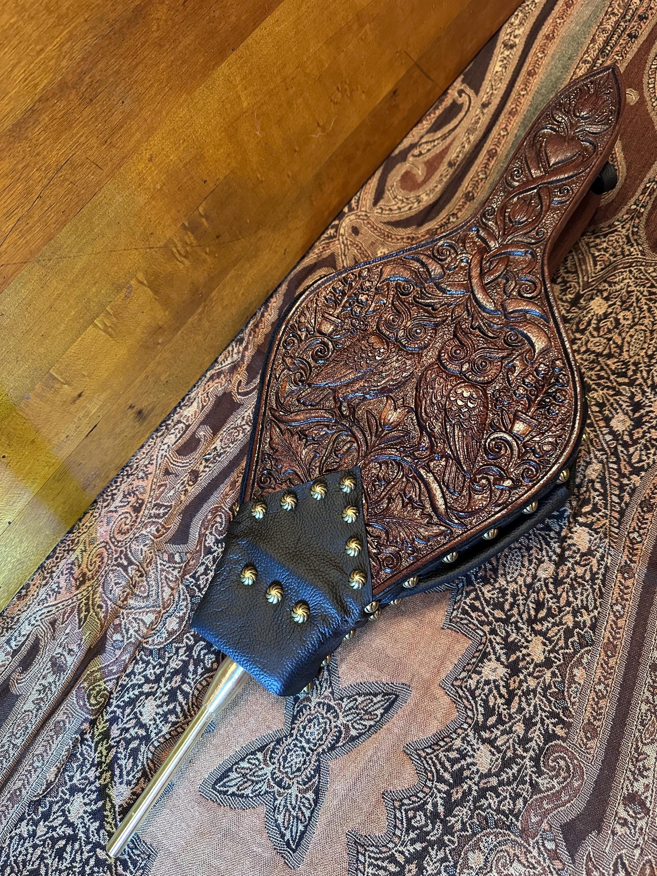 These exquisite handmade fireplace bellows are crafted from rich brown walnut and feature an intricately carved Black Forest–inspired design. The detailed carving showcases symmetrical owls, scrolling foliage, and traditional European motifs, giving the piece a timeless, old-world character.