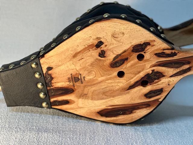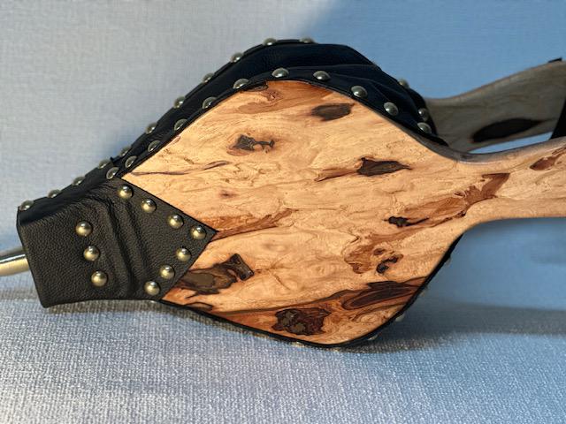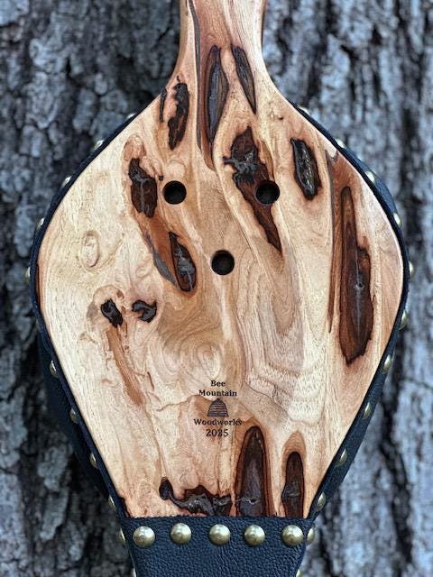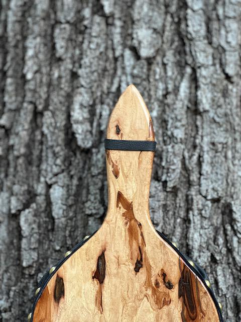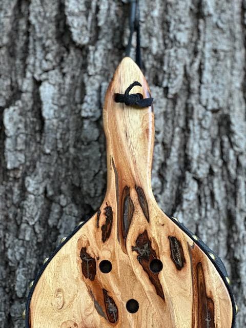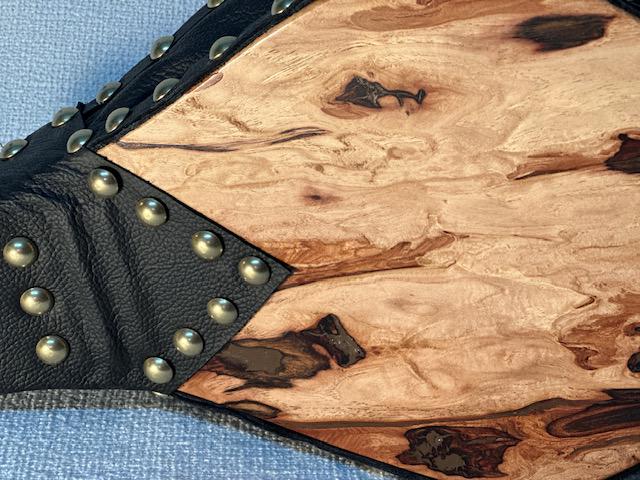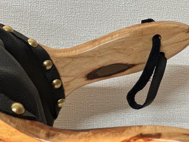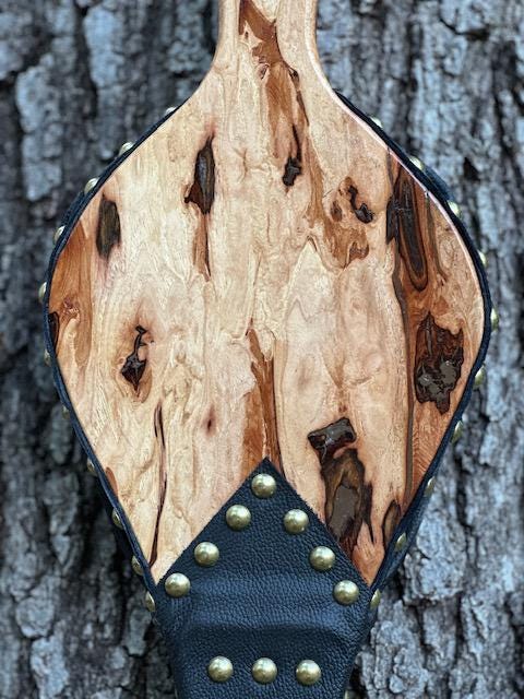 A leather hanging strap is threaded through the handle, allowing the paddles to be secured together for easy storage and beautiful display when not in use.