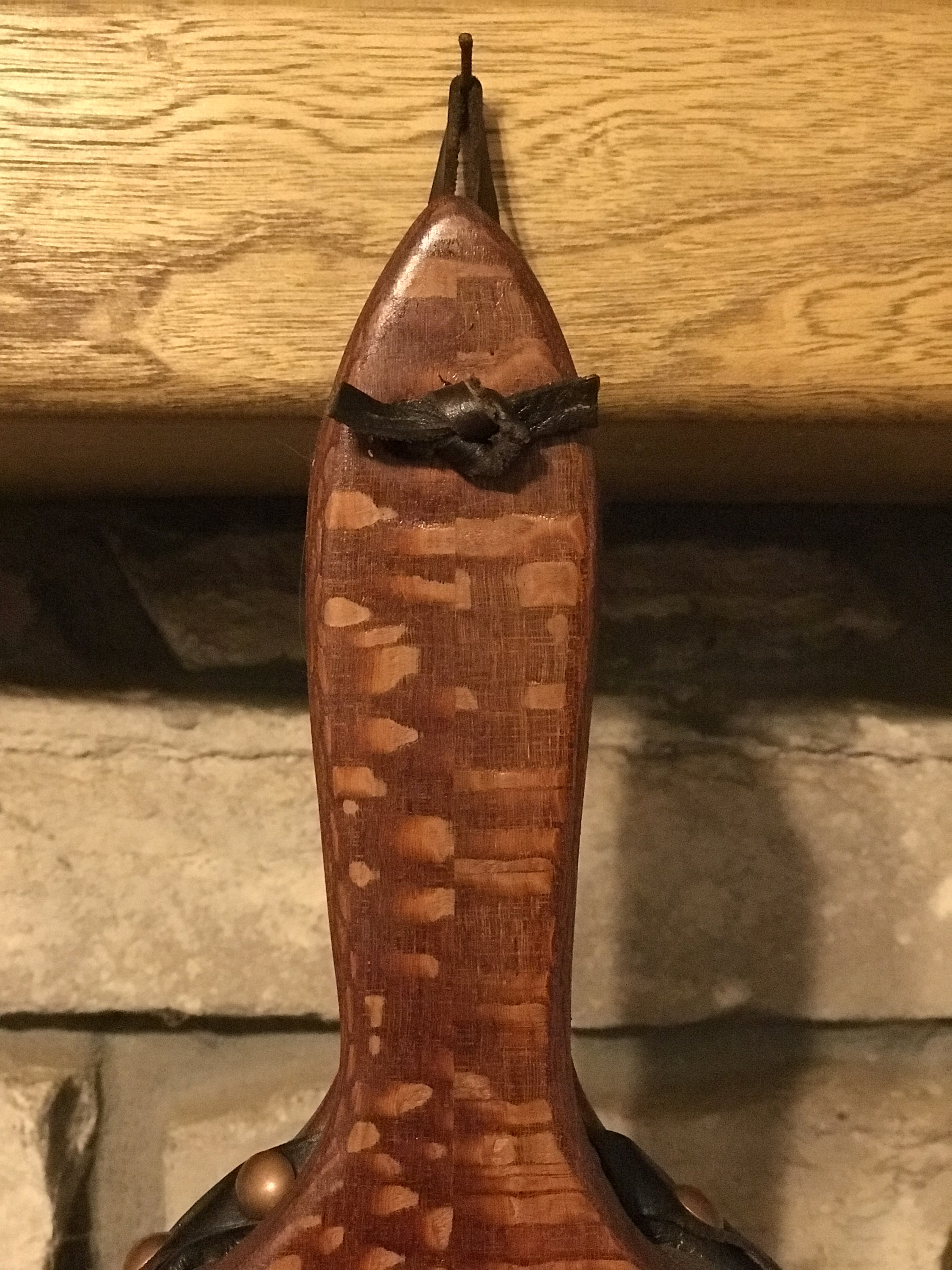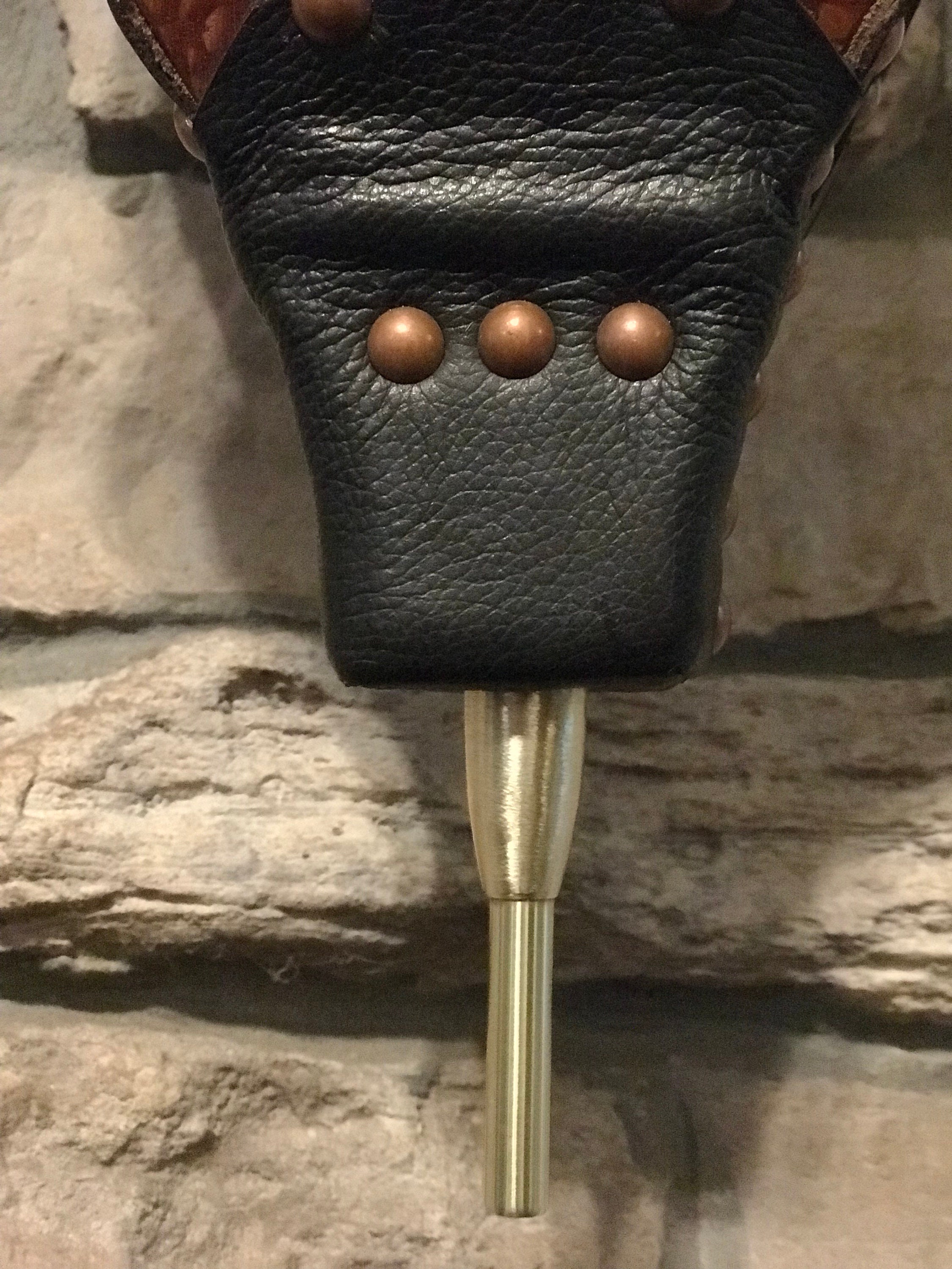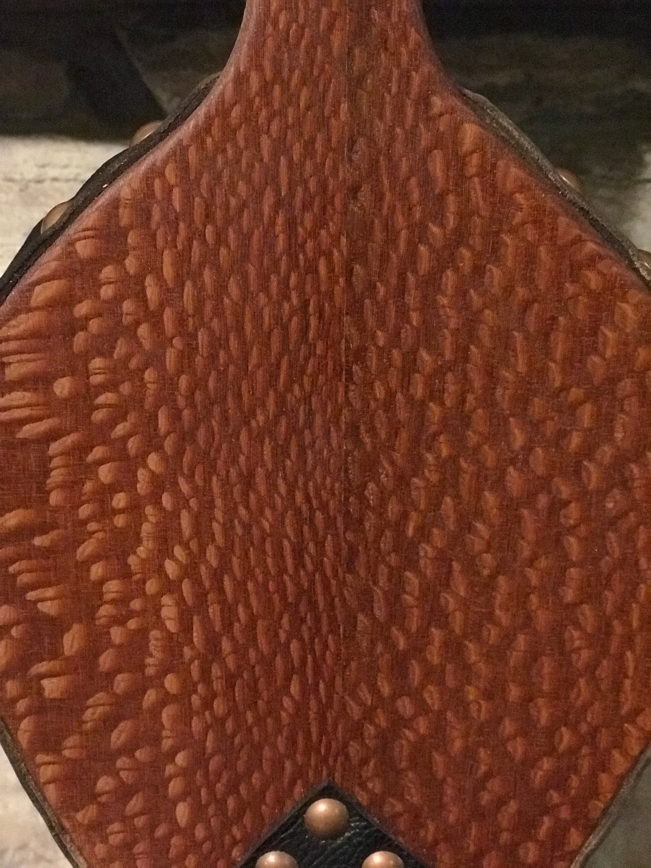 South American leopardwood bellows with dark brown leather and copper-colored tacks. These bellows are approximately 20 inches long and 7 inches wide. Leopardwood is a very heavy, dense wood, so these bellows are a handful! A sturdy brass hinge connects the paddles under the leather boot, which features a brass nozzle. These bellows are made to last for generations, while bringing a sense of history to your hearth. A few puffs from these bellows will help get a fire started in your fireplace, wood stove or fire pit.