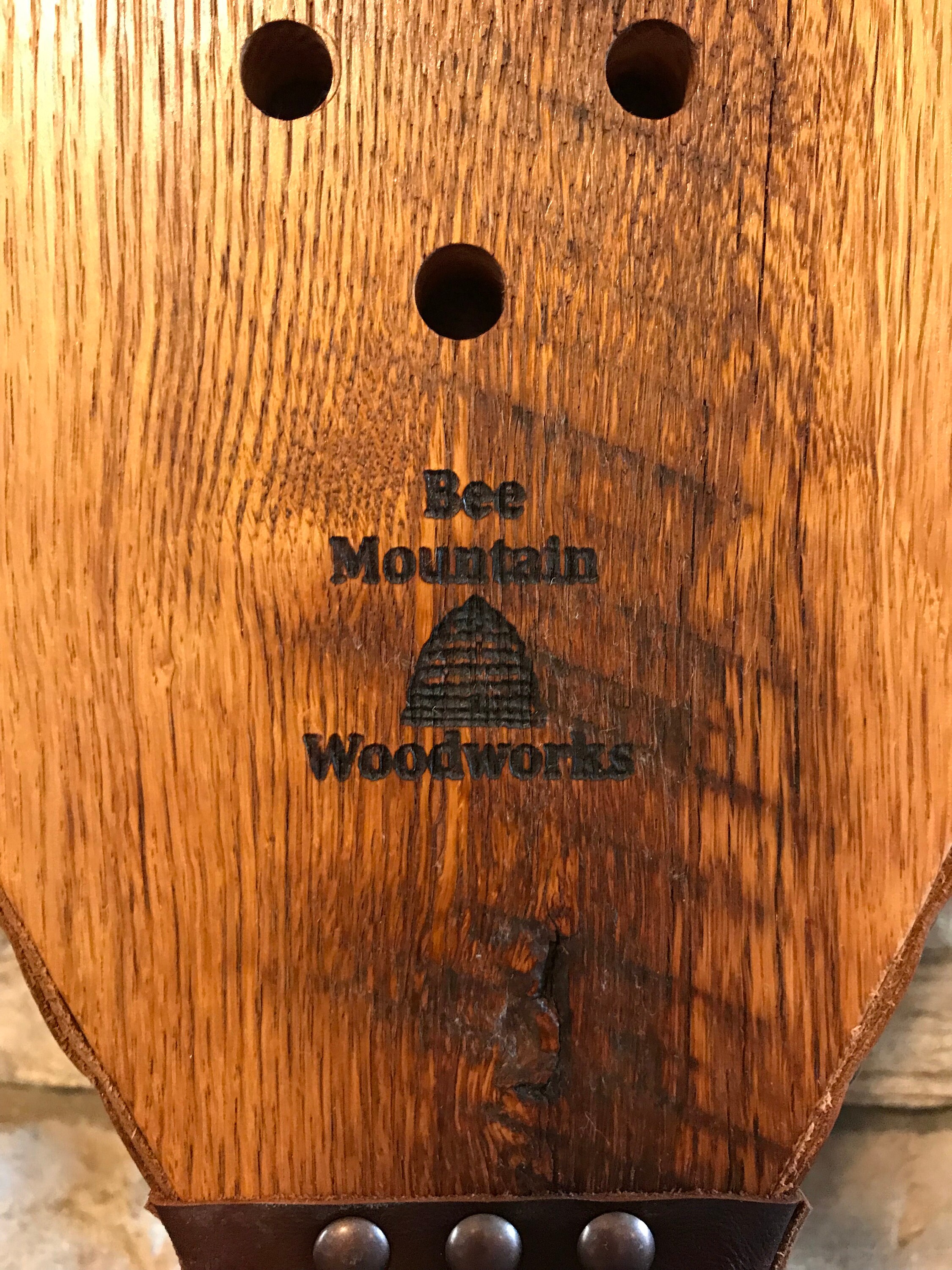 These bellows were crafted from an antique chestnut board that was salvaged from an old barn in East Tennessee. Minimal sanding and a simple rubbed tung oil finish allow the interesting grain of the old chestnut to show and gives these bellows a very authentic look. The original saw marks on the back were retained, and hearken back to a simpler time. The cracks and holes in the wood were left unfilled to retain the rustic nature of the wood. These bellows are approximately 19 inches long and 7 inches wide. The leather is a rich brown, and the tacks are a coppery bronze color. A leather strap is threaded through holes in the handle to hold the paddles together for storage and for hanging. A pair of sturdy brass hinges connects the paddles under the leather boot, which features a brass nozzle. These bellows are made to last for generations, while bringing a sense of history to your hearth. A few puffs from these bellows will help get a fire started in your fireplace, woodstove or fire pit.
